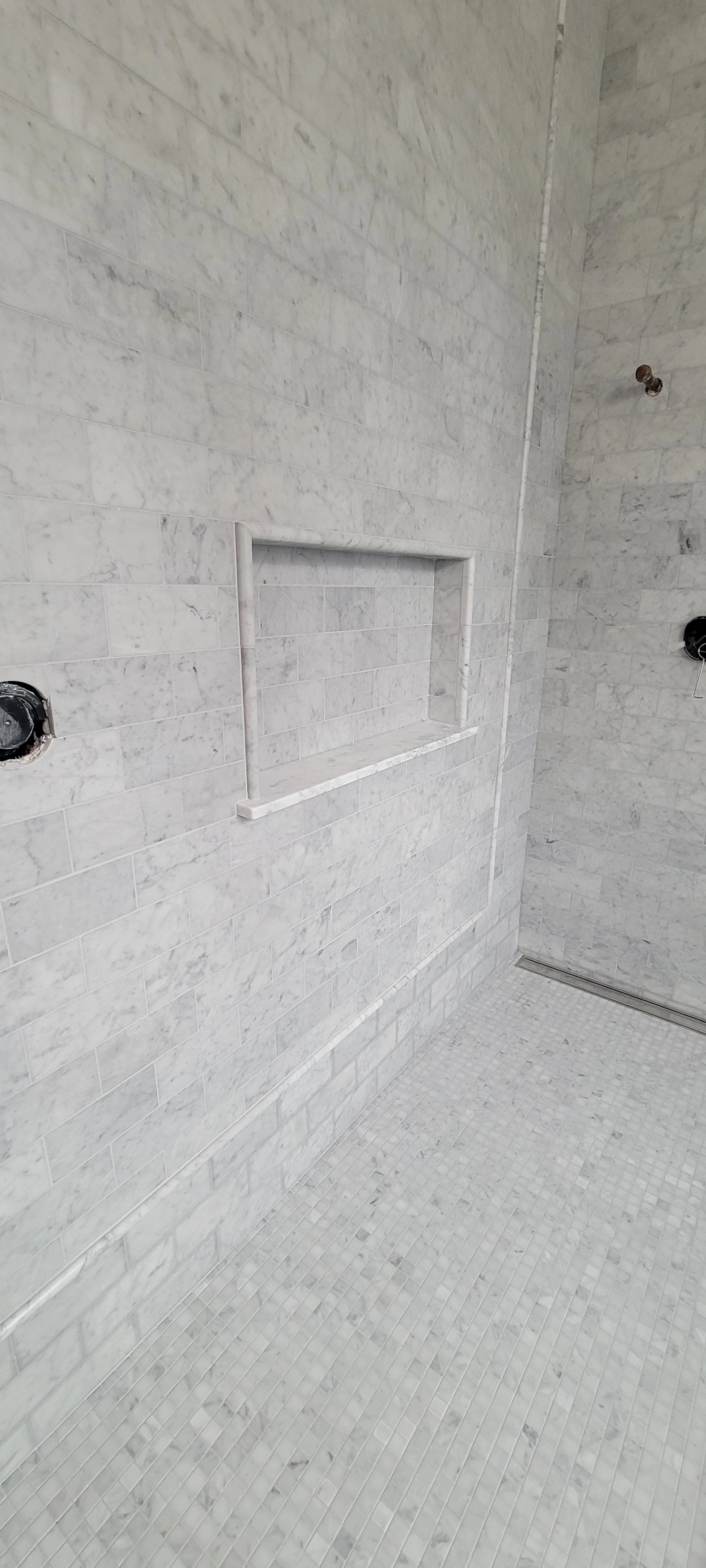 Honed Carrera Marble on Floors & Walls. Fully waterproofed, sealed, Epoxy grout.